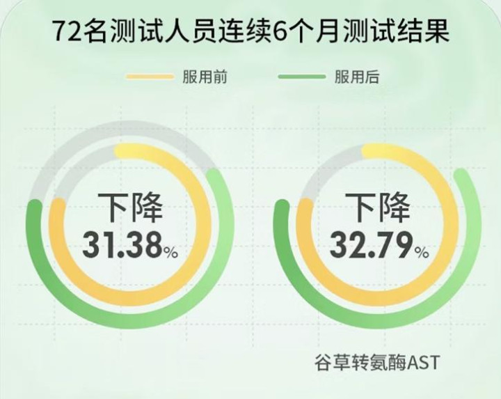 临床数据极具说服力:在100名脂肪肝受试者连续服用专利配方8周后,甘油三酯降低至1.6,总胆固醇下降至2.9;12周后,脂肪变性指数下降40.5%、氧化应激降低39.9%、炎症水平减少47.2%、转氨酶降低37%;谷丙转氨酶、甘油三酯、游离脂肪酸分别改善15.7%、16.2%、17.8%,乏力感改善-100%、眼黄改善-32%、口腔异味下降-26%。